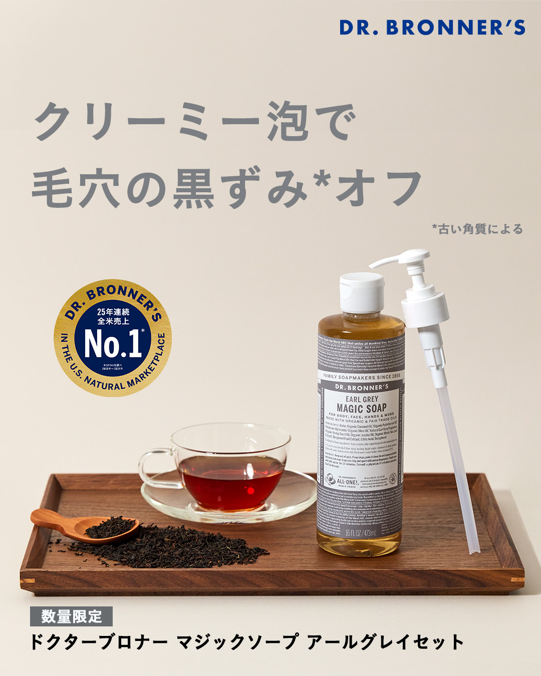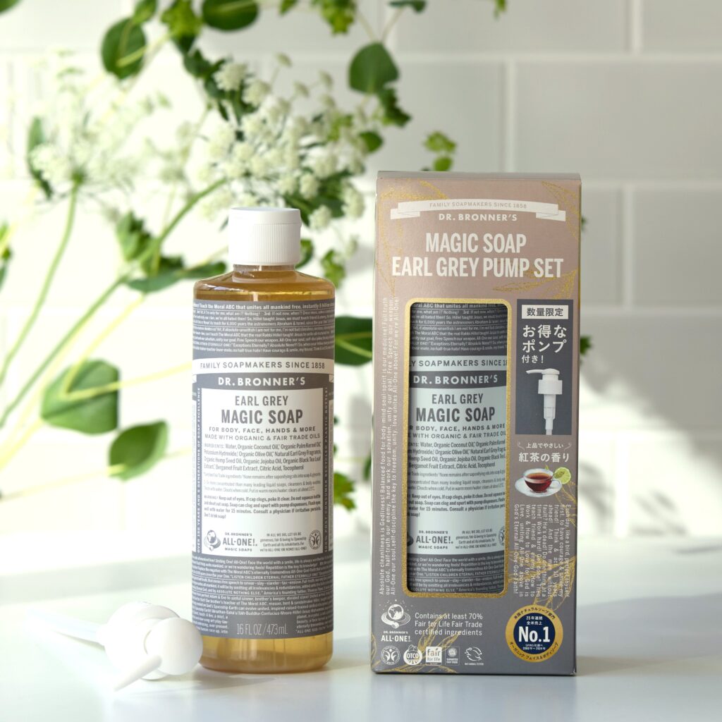マジックソープ アールグレイには、整肌成分として、無農薬有機栽培で育てられ、フェアトレードで調達したオーガニック茶葉エキスを配合しています。